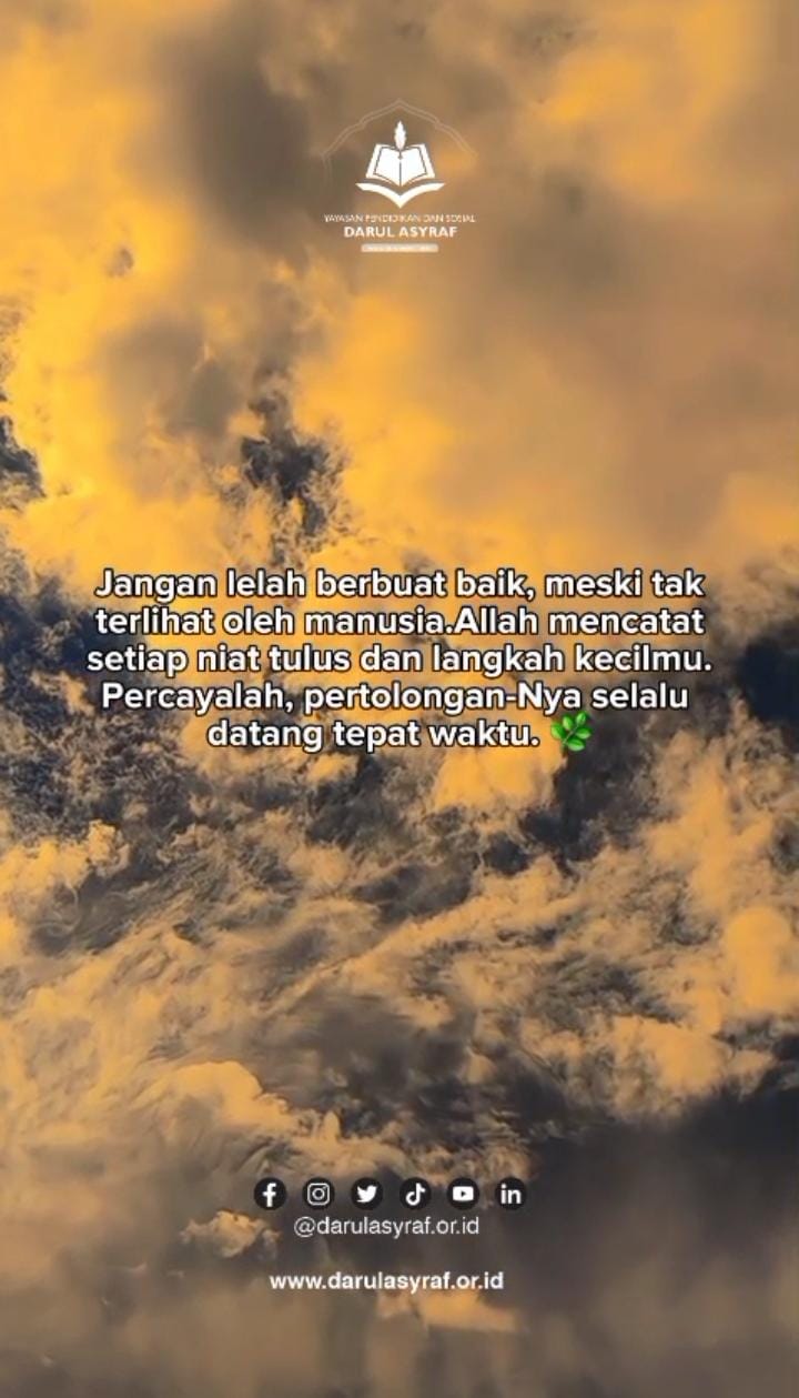 Jangan pernah ragu untuk terus berbuat baik, meski tidak ada yang melihat atau mengapresiasi. Jadikan Allah sebagai tujuan utama dalam setiap amal. Karena ketika manusia melupakan kebaikanmu, Allah tidak pernah melupakannya.