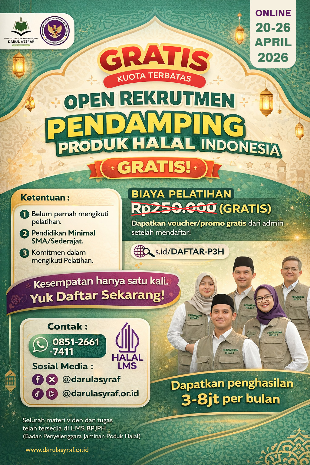 LP3H Yayasan Pendidikan dan Sosial Darul Asyraf bersama Badan Penyelenggara Jaminan Produk halal (BPJPH) Kementerian Agama Republik Indonesia menyelenggarakan Pelatihan dan sertifikasi Pendamping Proses Produk Halal secara online melalui Platform LMS BPJPH yang bisa diikuti oleh peserta pelatihan di seluruh Indonesia dengan waktu yang bisa diatur sendiri oleh peserta selama jadwal pelatihan tersedia. Peserta wajib menonton semua video yang ada secara berurutan dan mengerjakan semua tugas yang ada untuk mendapatkan kelulusan dan sertifikat pelatihan.