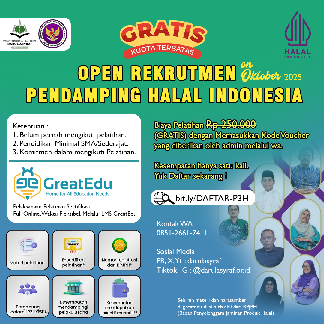 LP3H Yayasan Pendidikan dan Sosial Darul Asyraf bersama Badan Penyelenggara Jaminan Produk halal (BPJPH) Kementerian Agama Republik Indonesia menyelenggarakan Pelatihan dan sertifikasi Pendamping Proses Produk Halal secara online melalui Platform LMS Great Edu yang bisa diikuti oleh peserta pelatihan di seluruh Indonesia dengan waktu yang bisa diatur sendiri oleh peserta selama jadwal pelatihan tersedia. Peserta wajib menonton semua video yang ada secara berurutan dan mengerjakan semua tugas yang ada untuk mendapatkan kelulusan dan sertifikat pelatihan.